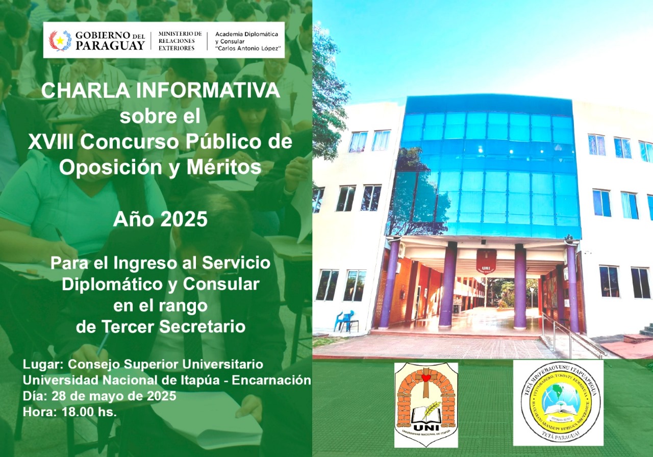 La Facultad de Humanidades, Ciencias Sociales y Cultura Guaraní de la Universidad Nacional de Itapúa invita a toda la comunidad universitaria a participar de la Charla Informativa sobre el XVIII Concurso Público de Oposición y Méritos – Año 2025, organizada por la Academia Diplomática y Consular “Carlos Antonio López” del Ministerio de Relaciones Exteriores.