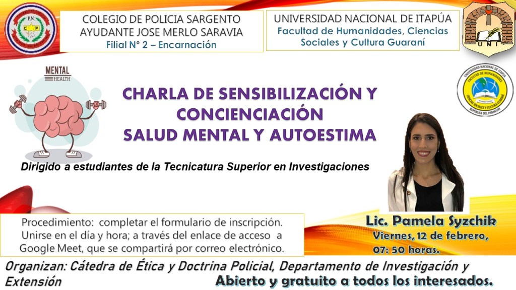 En tal sentido, desde la cátedra de Ética y Doctrina Policial, se prevé un espacio para una Charla de sensibilización y concienciación sobre estos temas de gran relevancia para la vida, mediante la predisposición y generosidad de la Lic. Pamela Syzchik, egresada de la carrera de Psicología Clínica y Laboral.