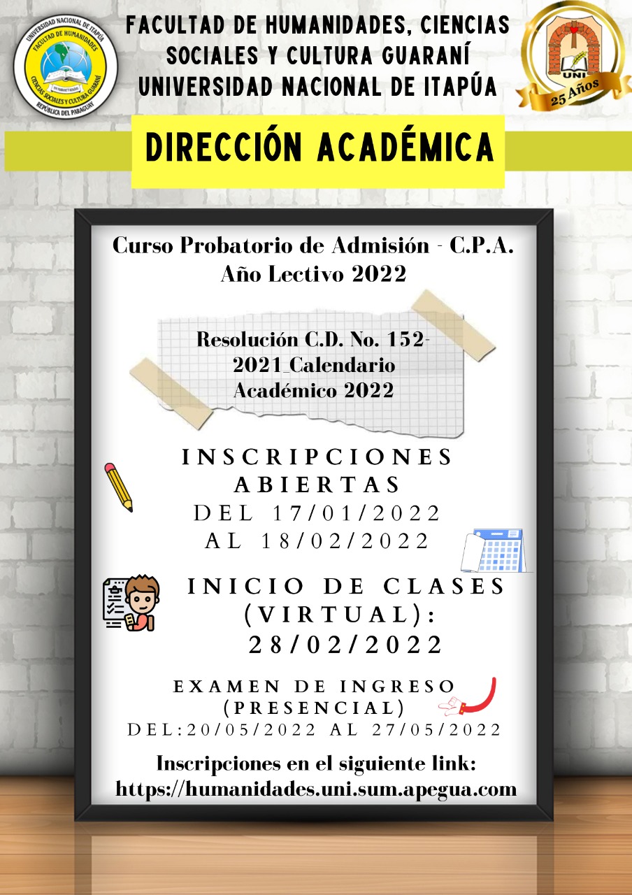 Carreras de Grado a ser Habilitadas – Año Lectivo 2022 en la Facultad de Humanidades, Ciencias Sociales y Cultura Guaraní.