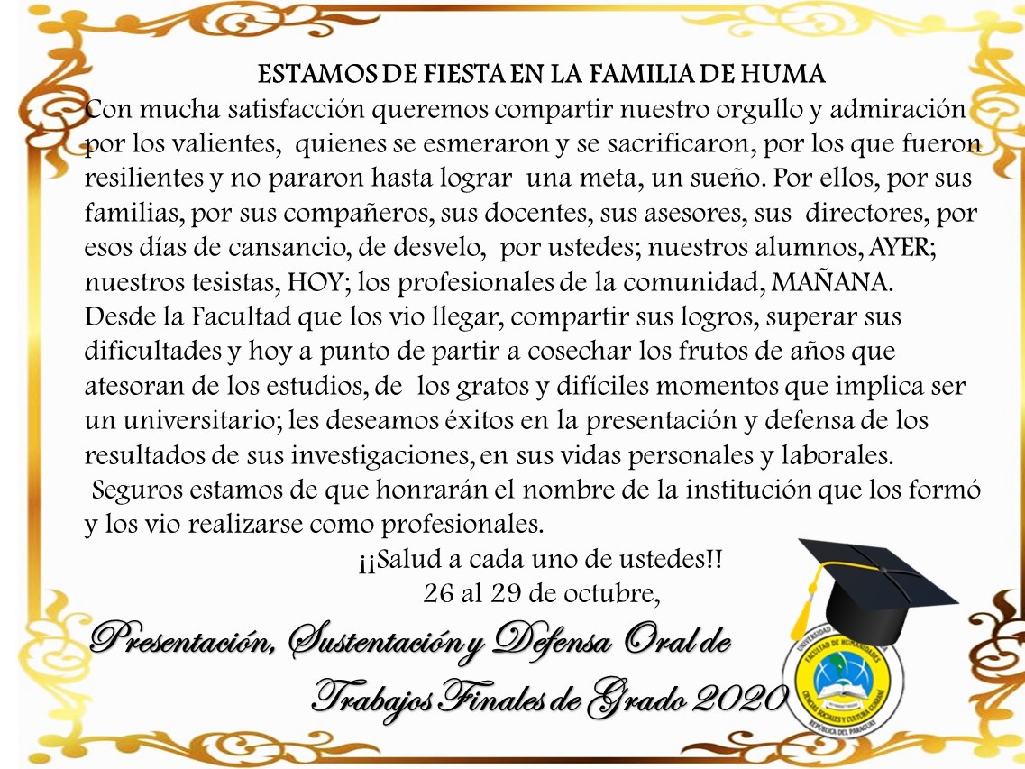 Desde la Facultad que los vio llegar, compartir sus logros, superar sus dificultades y hoy a punto de partir a cosechar los frutos de años que atesoran de los estudios, de los gratos y difíciles momentos que implica ser un universitario; les deseamos éxitos en la presentación y defensa de los resultados de sus investigaciones, en sus vidas personales y laborales.