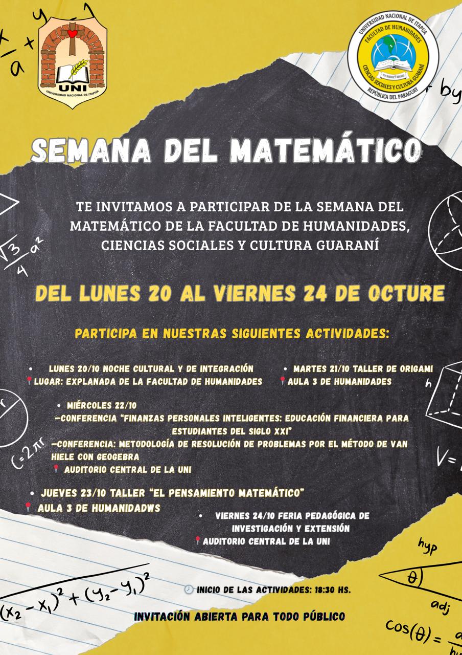 La Facultad de Humanidades, Ciencias Sociales y Cultura Guaraní de la Universidad Nacional de Itapúa llevará adelante la Semana del Matemático 2025, un espacio dedicado al aprendizaje, la creatividad y la divulgación científica en torno al apasionante mundo de la matemática.